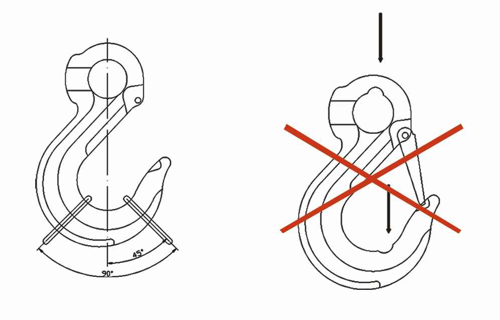 3.当两个吊索放入吊钩时,从垂直平面至吊索拉开的角度不能大于45°,且两个吊索之间的夹角不许超过90°,如图: